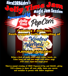 9:30 PM – ???? | JOLLY TIME JAM – NEW FOR 2025 Super Special Late Night Jam Session featuring some very popular “name” magicians! ![]() Enjoy free flavored popcorns and soda sponsored by JOLLY TIME POPCORN! |